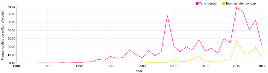 Another gender based policy that was being discussed around this time was gender pay gap. Figure 3 tracks the use of the term gender pay gap between 1980 and 2019.