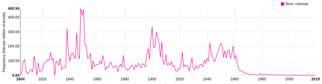 Figure 3 (seen above) shows the use of term colonial between the years 1804 to 2019. It shows that the term was already in use by the 18th century, most likely due to the fact that colonies were established from as early the 17th century. The figure also shows that there are a number of peaks across this time period, with a sharp drop off in the 1960s.