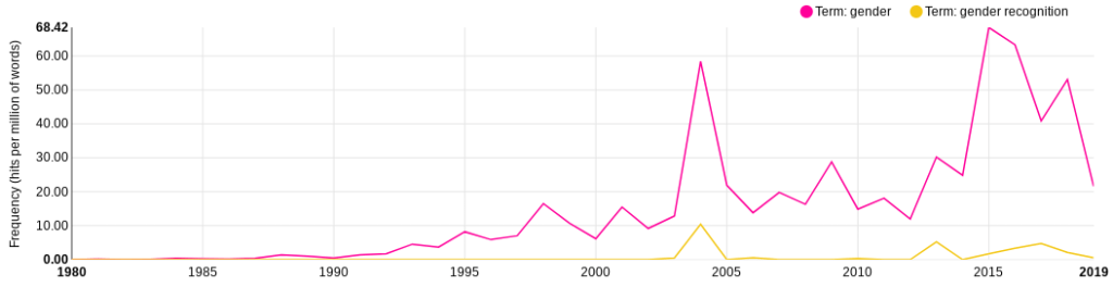 One of the policies that was being discussed was gender recognition, with the Gender Recognition Act being passed in 2005. Figure 2 tracks the use of the term gender recognition between 1980 and 2019.